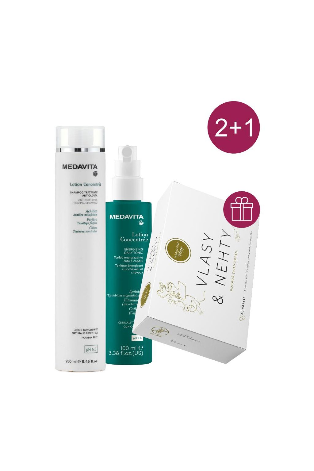 Akce 2+1 Medavita LC proti padání šampon, Daily tonikum +ZDARMA Kapsle pro vlasy a nehty