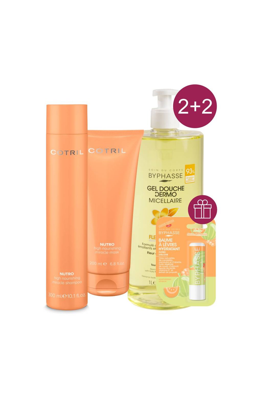 Akce 2+2 Cotril NUTRO šampon, maska +ZDARMA Byphasse dermo sprch. gel 1L Tiaré a Fruity Balzám na rty