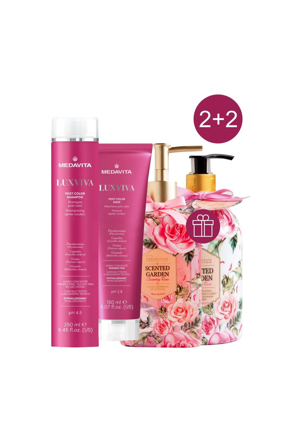 Akce 2+2 Medavita LUXVIVA šampon, balzám +ZDARMA IDC sprchový gel a tělo krém