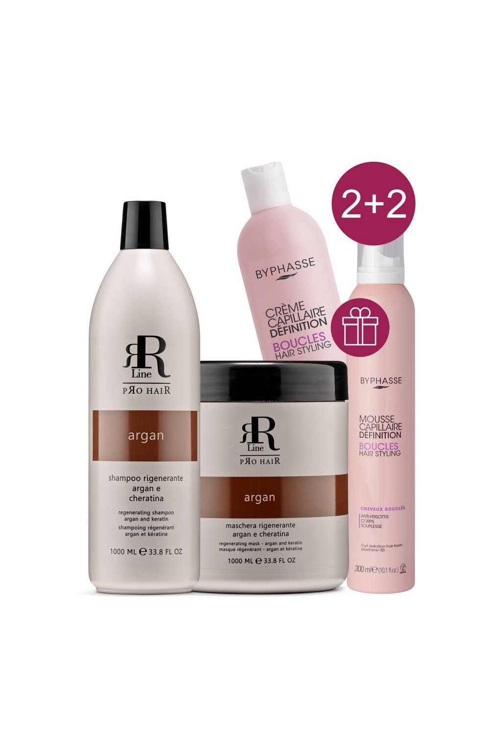 Akce 2+2 RR Line ARGAN šampon 1L, maska 1L +ZDARMA Byphasse Boucles loknovač pěna a krém