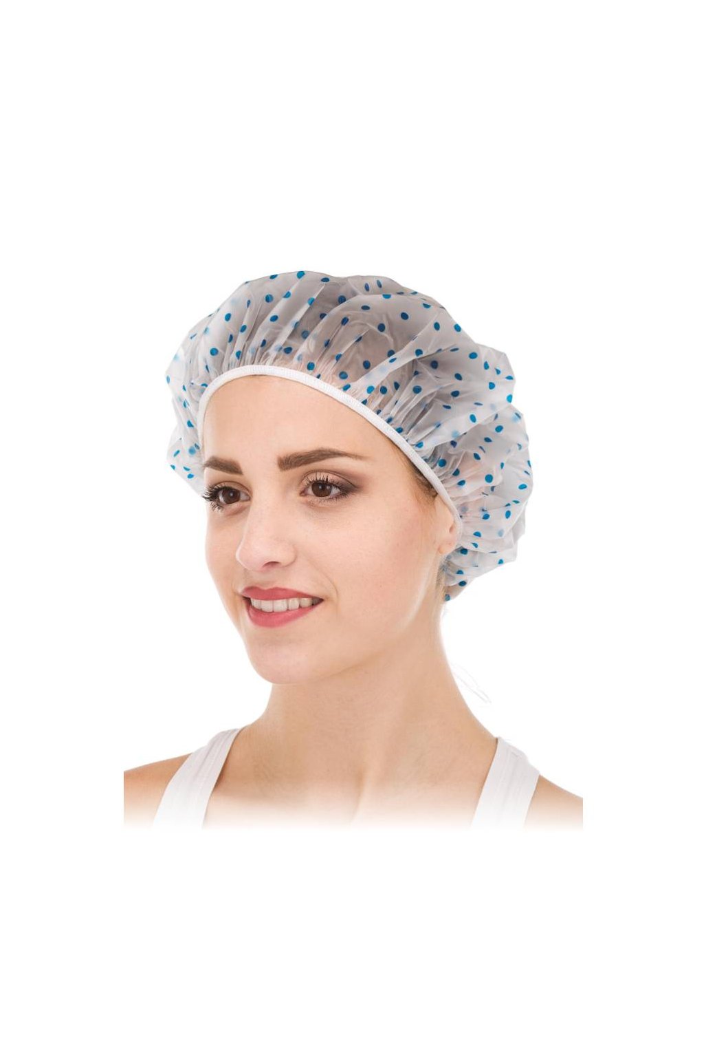Čepice sprchovací pevná na gumičku 1ks, modré puntíky