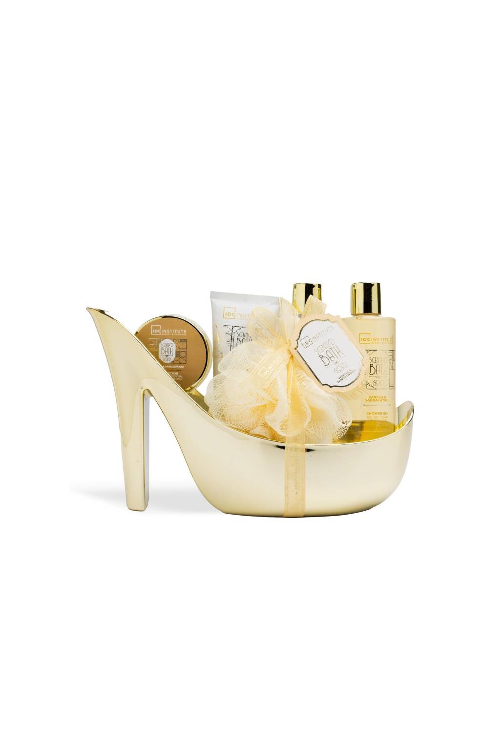 IDC Institute Scented Luxusní dárková sada do koupele IDC Institute Scented Bath Gold – Heel. Set nabízí kompletní péči o tělo. Sada obsahuje sprchový gel (200 ml), tělové mléko (200 ml), krém na ruce (90 ml), tělový peeling (50 g) a hubku do koupele. Všechny produkty jsou zabaleny v elegantním dárkovém balení ve tvaru zlatého střevíčku, které působí luxusně a originálně. Příjemná kombinace vanilky a santalového dřeva navozuje atmosféru pohody, relaxace a luxusu. Ideální jako dárek pro ženy, které si chtějí dopřát chvíle odpočinku a péče o pokožku. Vhodné pro všechny typy pokožky.