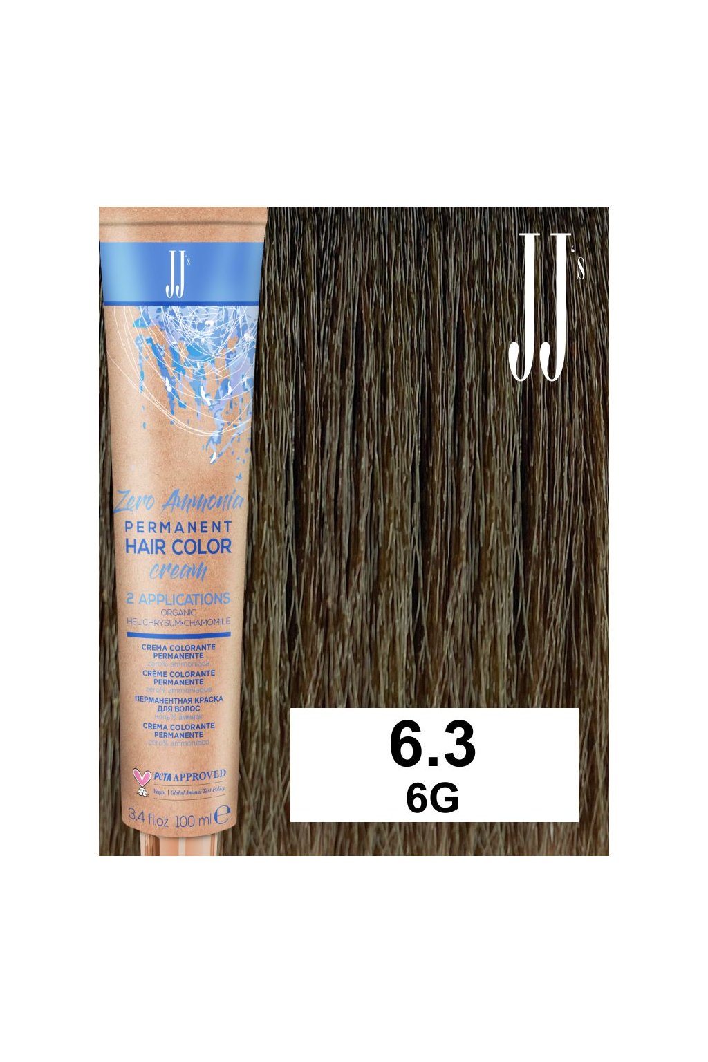 JJ PERMANENT HAIR COLOR CREAM - ZERO AMMONIA 100 ml - Profesionální permanentní barva na vlasy bez amoniaku s obsahem heřmánku a smilu italského má zklidňující, vyživující a upravující účinky. Kvalita použitých pigmentů obsažených v tomto krému má schopnost pokrýt první šediny, oživit barvu, dodat lesk přírodním vlasům nebo do již nabarvených délek, tlumit účinky super zesvětlujících barev, dodat pigment vlasům před jejich permanentním barvením. Neobsahuje amoniak, a proto je barva vhodná i pro klienty, kteří se se světem barvy setkávají poprvé. Všechny odstíny lze míchat mezi sebou. Vegan složení obohaceno o Plex komplex pro maximálně stejnoměrné pokrytí, účinné aktivní látky organický smil italský a heřmánek s mnoha příznivými účinky na vlasy. Vynikající výrobní technologie na trhu s kontrolou pigmentů na takové úrovni jako nikdy v minulosti zaručuje intenzivní, zářivé a jasné barvy s dlouhotrvajícím účinkem, perfektní odolnost barvy, stabilitu odstínů a stoprocentní krytí šedin. Certifikát PETA APPROVED VEGAN zaručuje, že přípravky neobsahují žádné živočišné složky.