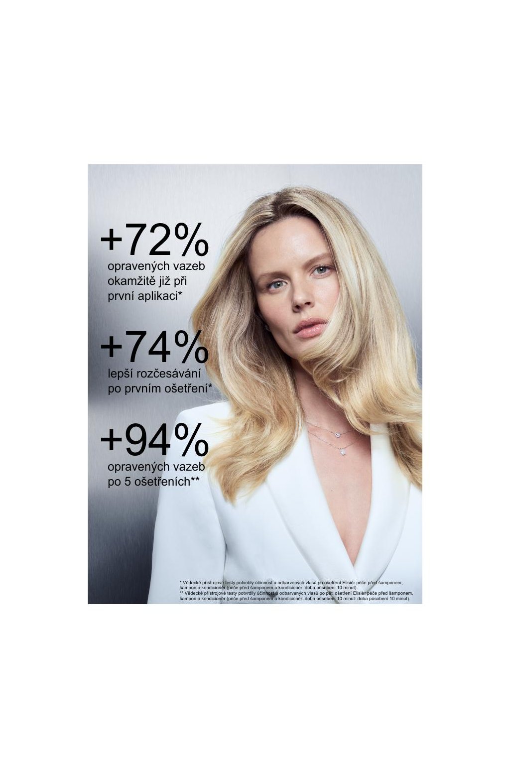 * Vědecké přístrojové testy potvrdily účinnost u odbarvených vlasů po ošetření Elisièr péče před šamponem, šamponu a kondicionéru (péče před šamponem a kondicionér: doba působení 10 minut).
