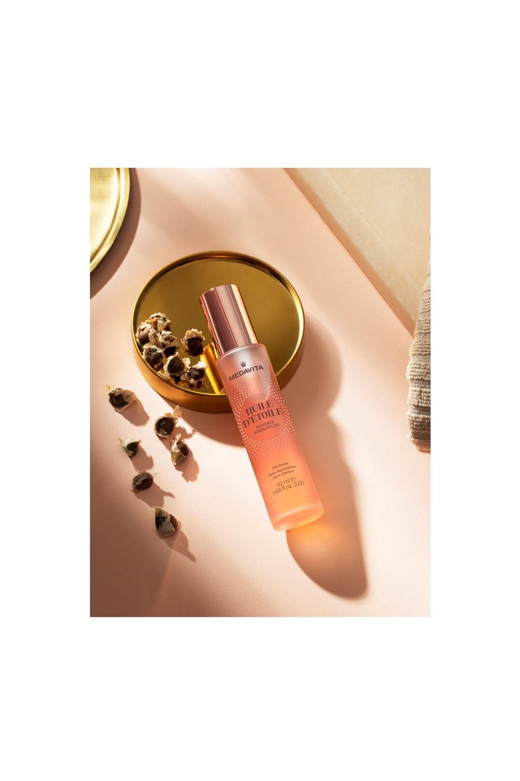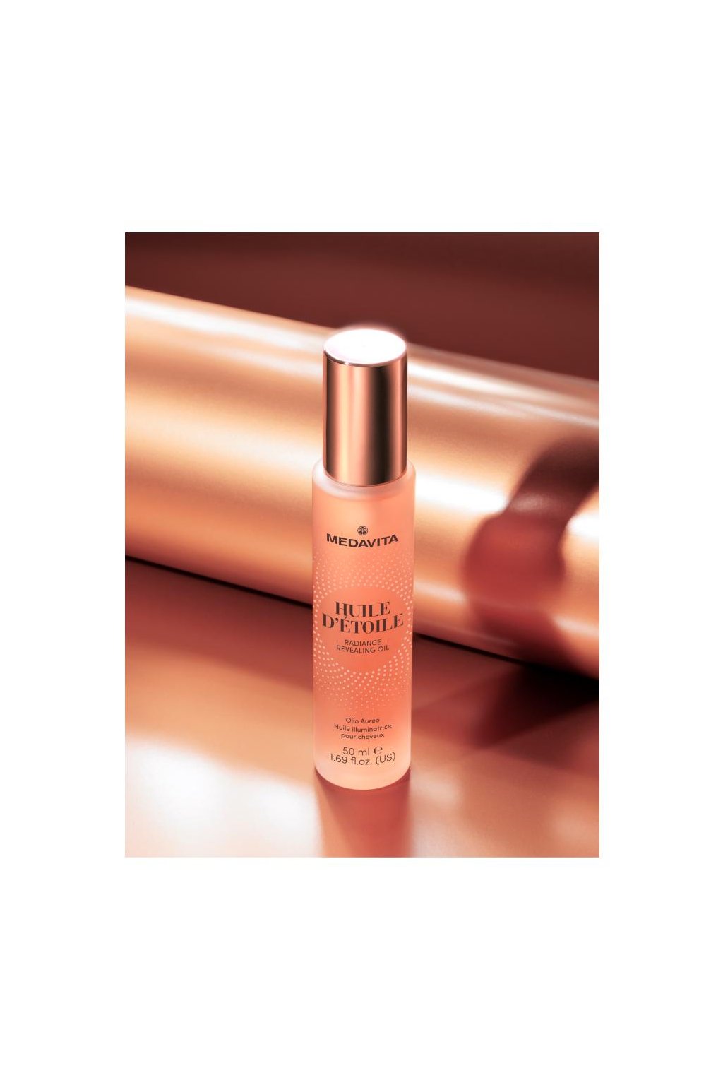 Medavita HUILE d'Etoile Radiance Revealing Oil - OLEJ PRO NÁDHERNÉ VLASY - Olej pro výrazný lesk vlasů s hedvábným efektem. Sametová textura a rychlé vstřebání vlasy okamžitě rozzáří, získají neuvěřitelný lesk, hebkost, lehkost a jsou hedvábné na dotek s okouzlující vůní. Exkluzivní komplex olejů (Sacha inchi, Moringa, Zemní mandle, lněná semínka), bohatý na přírodní antioxidanty dává extrémní lesk a výživu vlasovému vláknu, chrání vlasy a zabraňuje dehydrataci. Vhodný pro všechny typy vlasů, pro každý den, i pro použití několikrát denně, pro okamžitou krásu vlasů.
