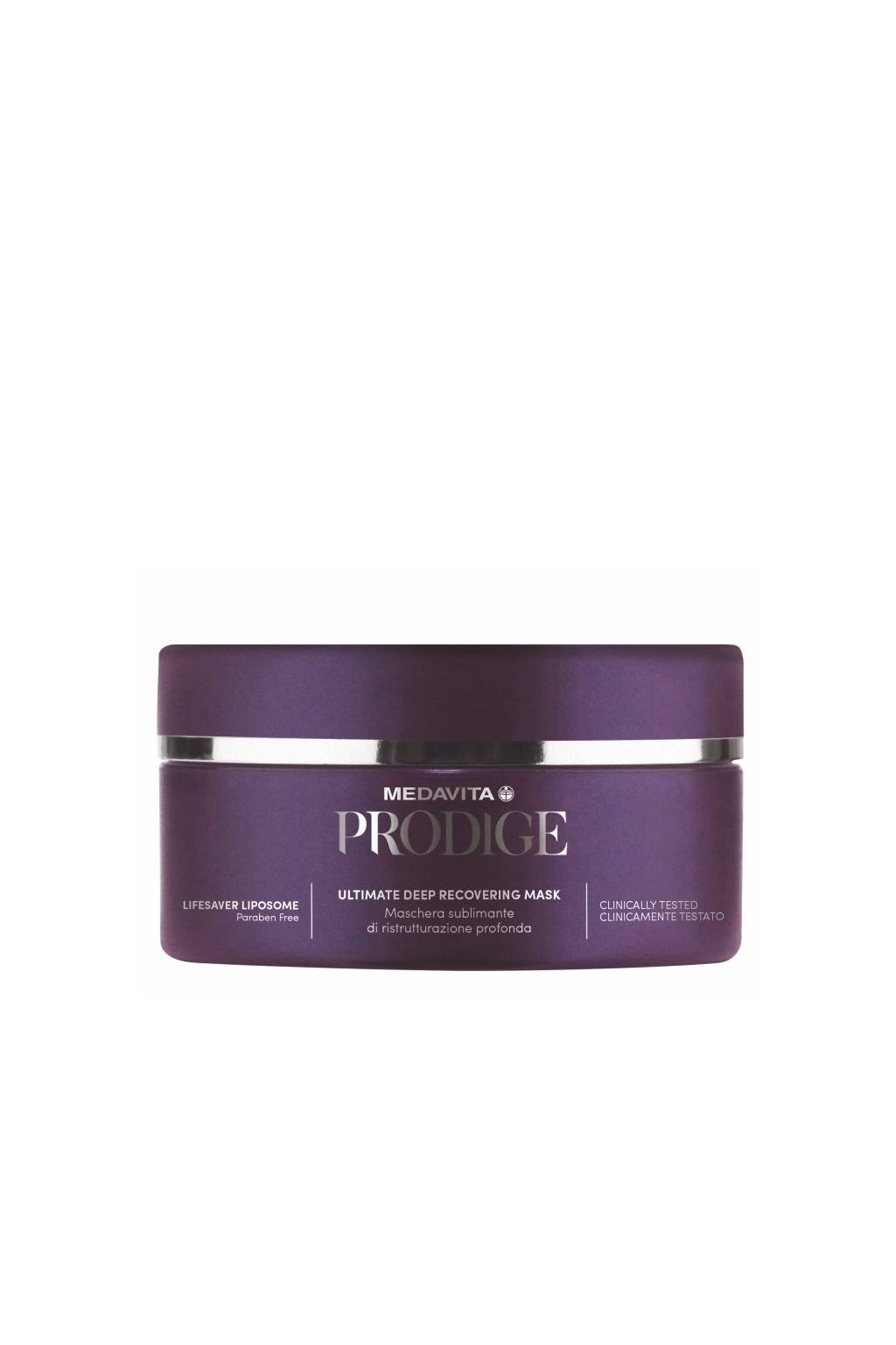 Medavita PRODIGE - ULTIMATE DEEP RECOVERING MASK pH 2.8 - Regenerační maska se silným obnovujícím účinkem na vlasové vlákno. Uzavírá kutikulu vlasu (vrchní vrstva), fixuje účinné látky séra PRODIGE Instant magnifying serum do vlasového vlákna, vyživuje proteinovou strukturu vlasů, dodává jim okamžitou sílu a hebkost. Obsahuje lipozom HIT (leucin, izoleucin, valin, hydrolyzované proteiny pšenice, kreatin), ceramidy, sezamový olej.