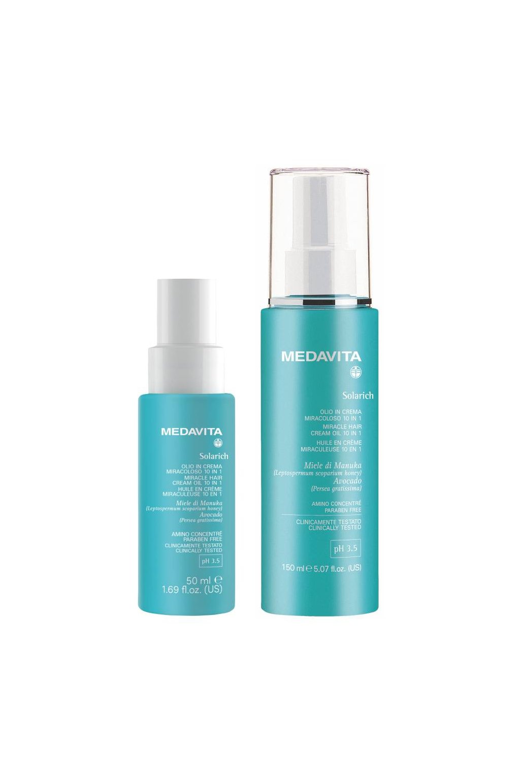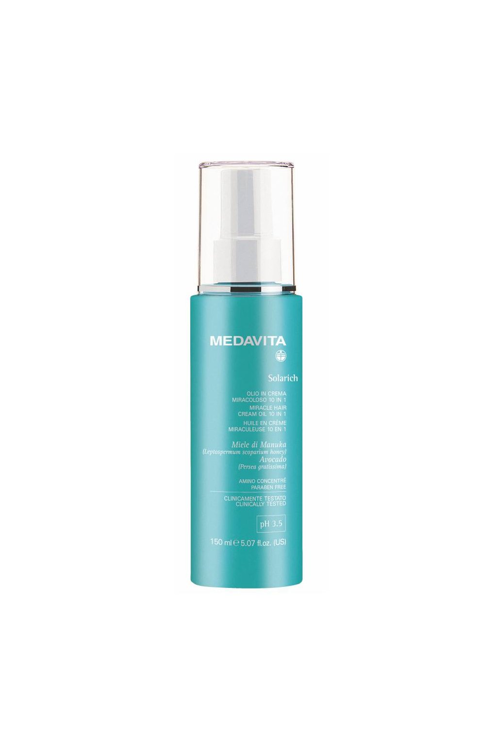Medavita SOLARICH Krémový olej ve spreji 10v1 před a po slunění, pH 3,5. Ochranný krémový olej na vlasy pro ultra snadné rozčesávání vlasů před a po vystavení slunci, 10 akcí v 1. Díky přítomnosti filtrů UVA / UVB zachovává a chrání strukturu a barvu vlasového vlákna před slunečním zářením. Jeho textura je bohatá i lehká zároveň, vlasům vystavováním působení chlóru a negativním atmosférickým vlivům přináší intenzivní výživu bez zatížení, hydrataci a brilantnost. Voděodolný. S obsahem manukového medu, avokádového oleje, aloe vera, alantoinem, kolagenovými proteiny a koncentrovaným komplexem aminokyselin